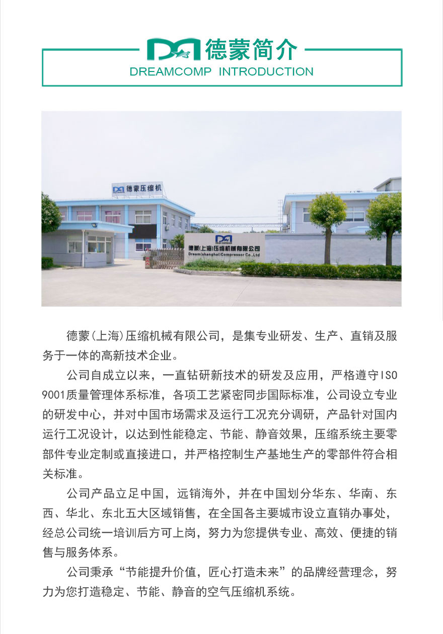 德蒙(上海)压缩机械有限公司,是集专业研发、生产、直销及服务于一体的高新技术企业。.公司自成立以来,一直钻研新技术的研发及应用,严格遵守ISO 9001 质量管理体系标准,各项工艺紧密同步国际标准,公司设立专业的研发中心,并对中国市场需求及运行工况充分调研,产品针对国内运行工况设计,以达到性能稳定、节能、静音效果,压缩系统主要零部件专业定制或直接进口,并严格控制生产基地生产的零部件符合相关标准。