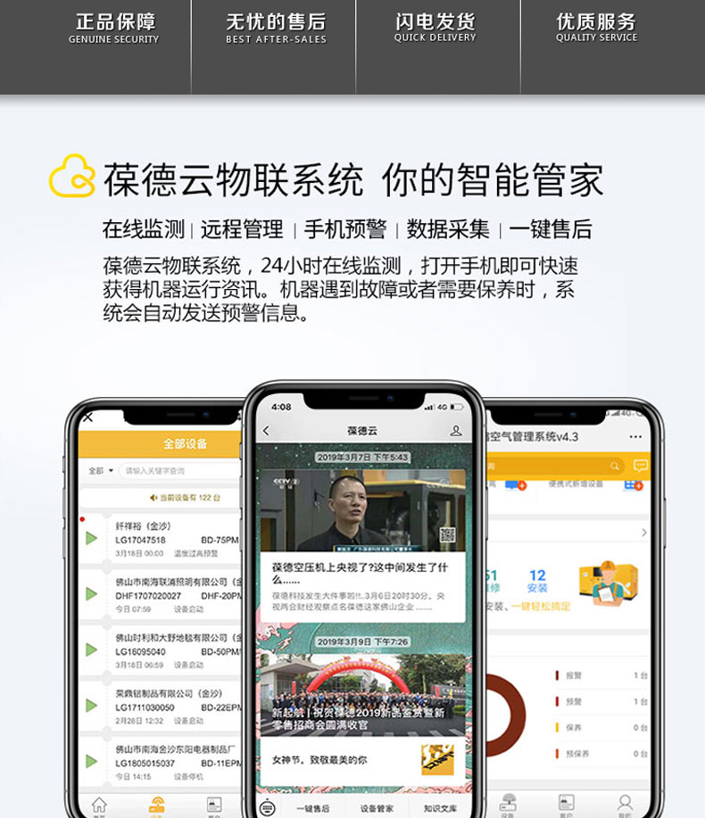 广东葆德科技有限公司投资成立互联网科技公司,开发物联网技术,打造了完整的空压机制造、销售、服务生态圈,并在全国建立了一百多家销售服务网点,多家仓储中心,分布在全国各大城市。行业首创的销售、服务的新零售共享模式,创新打造工业领域的“滴滴”模式,颠覆了行业传统,彻底解决了设备售后服务难、服务无标准的问题!