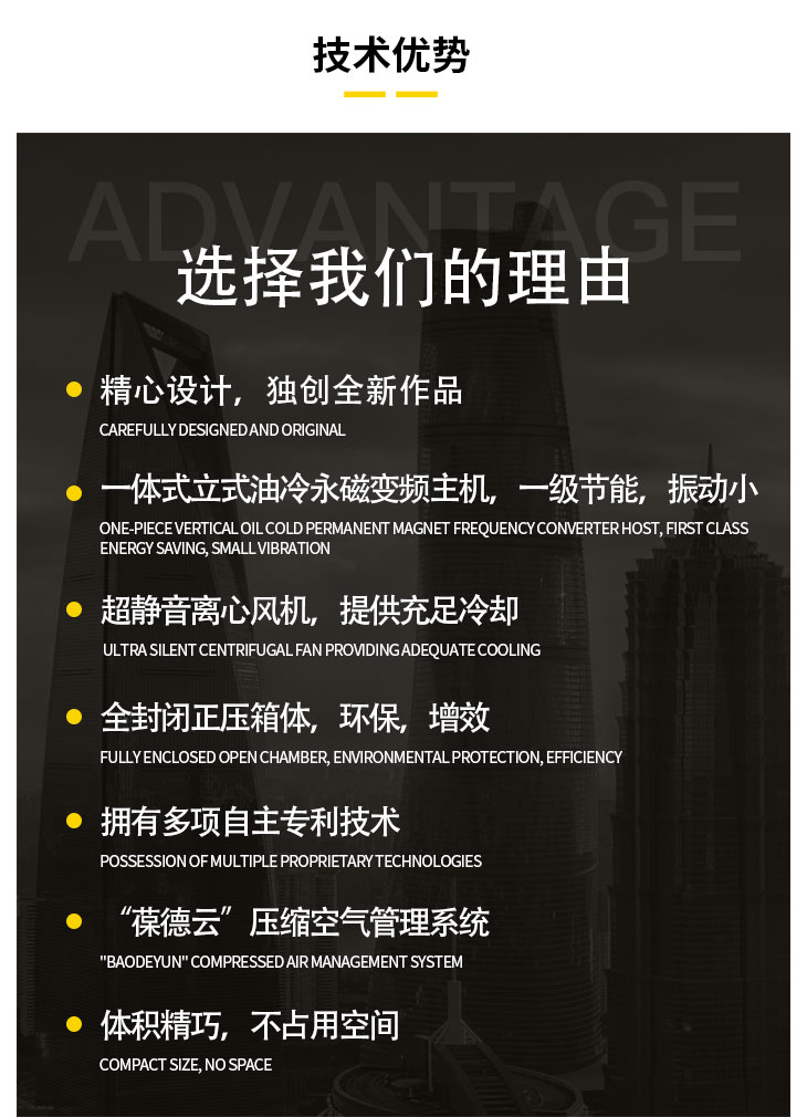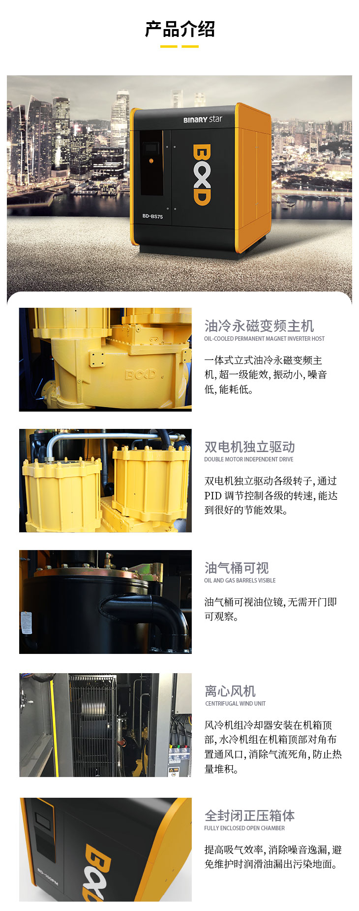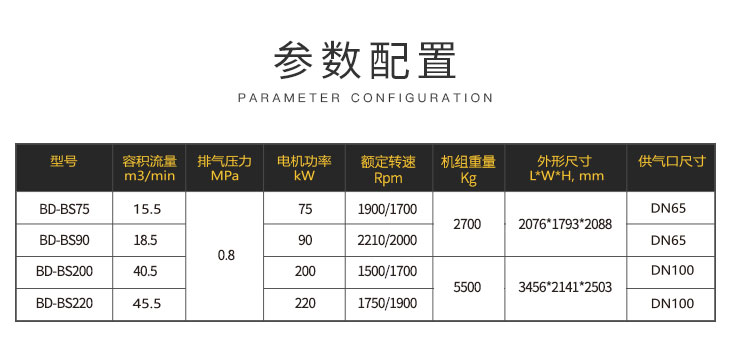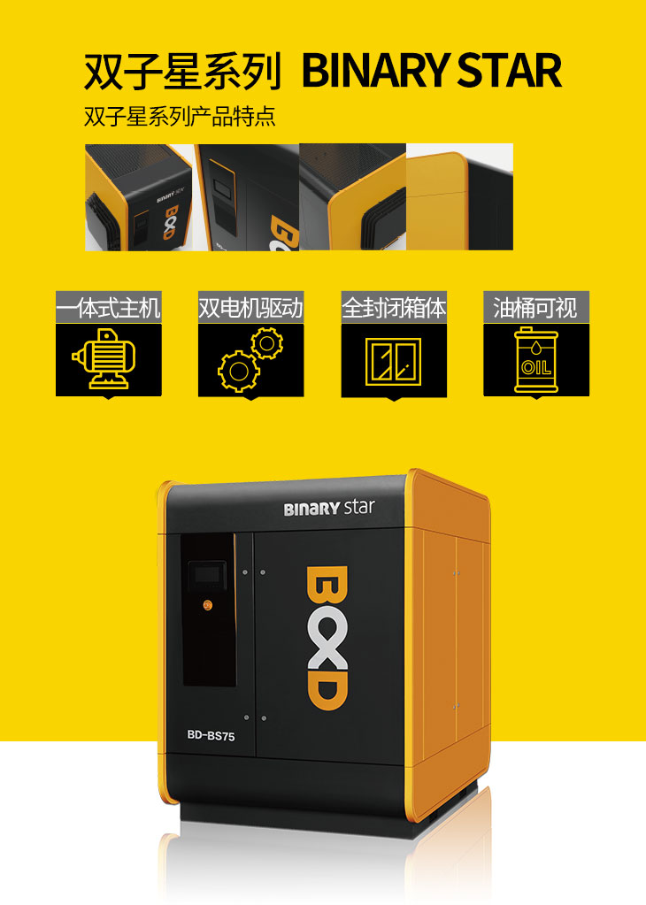 葆德双子星二级压缩空压机特点:油冷永磁变频主机,双电机独立驱动,一级节能等,型号:BD-BS75/A、BD-BS75/W、BD-BS90/A、BD-BS90/W、BD-BS200/A、BD-BS200/W、BD-BS220/A、BD-BS220/W