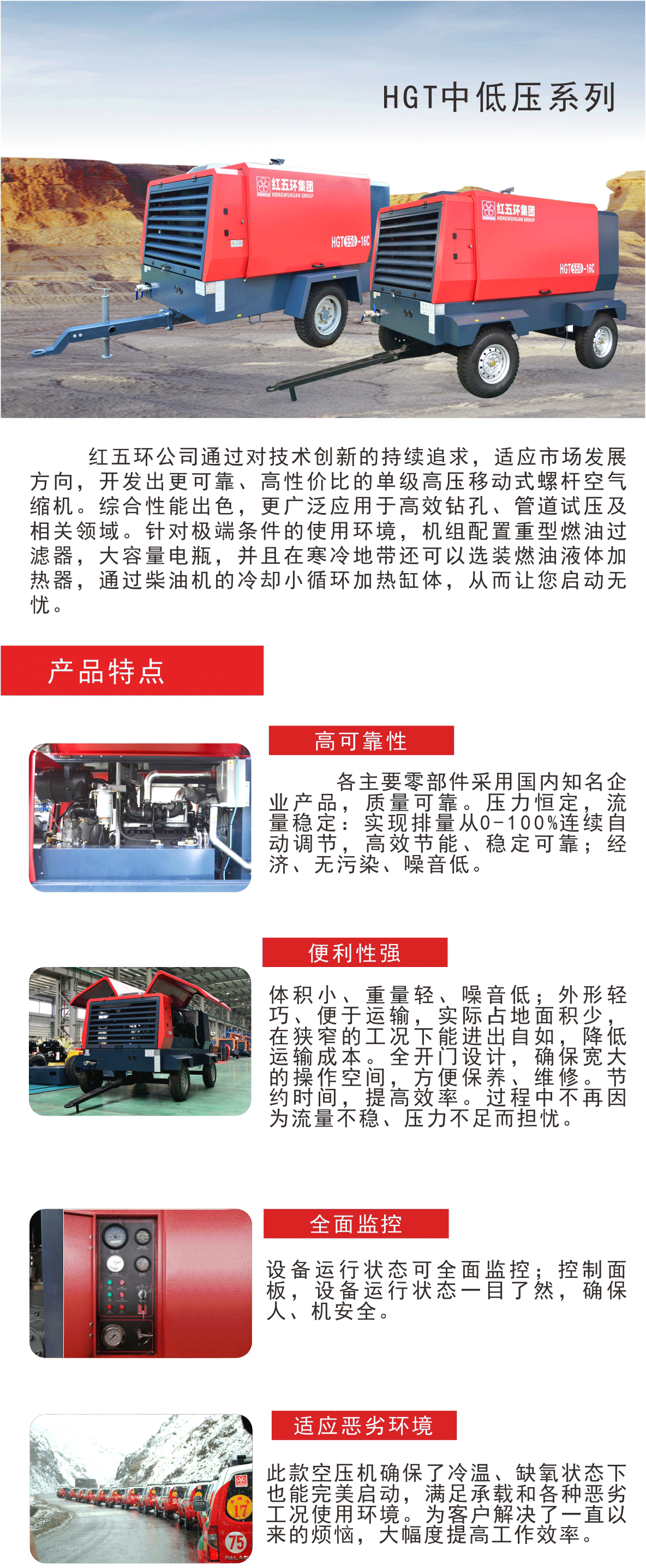 红五环公司通过对技术创新的持续追求,适应市场发展方向,开发出更可靠、高性价比的单级高压移动式螺杆空气缩机。综合性能出色,更广泛应用于高效钻孔、管道试压及相关领域。针对极端条件的使用环境,机组配置重型燃油过滤器,大容量电瓶,并且在寒冷地带还可以选装燃油液体加热器,通过柴油机的冷却小循环加热缸体,从而让您启动无忧。