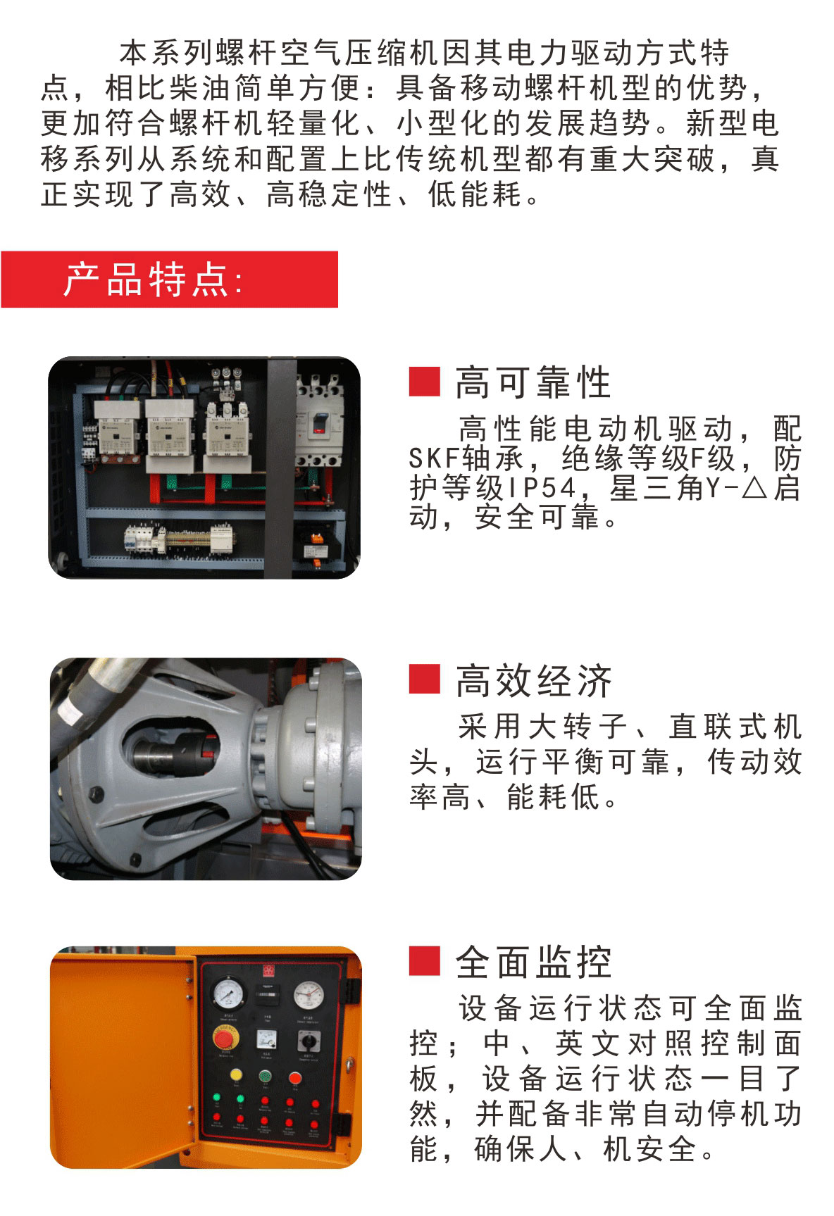 本系列螺杆空气压缩机因其电力驱动方式特点,相比柴油简单方便:具备移动螺杆机型的优势,更加符合螺杆机轻量化、小型化的发展趋势。新型电移系列从系统和配置上比传统机型都有重大突破,真正实现了高效、高稳定性、低能耗。