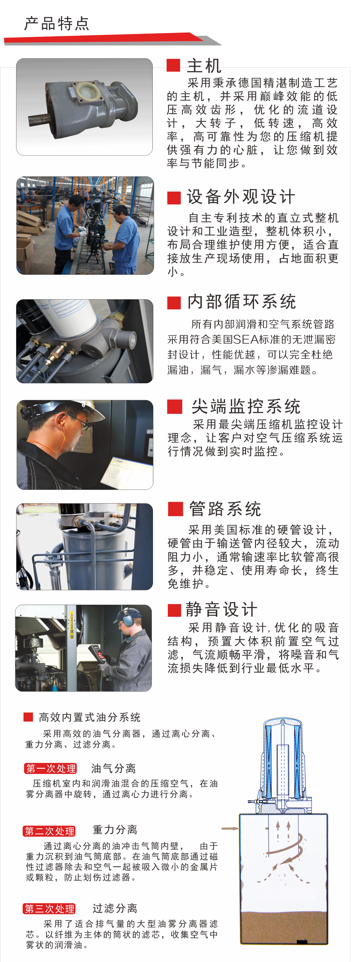 1.)主机:采用秉承德国精湛制造工艺的主机,并采用巅峰效能的低压高效齿形,优化的流道设计,大转子,低转速,高效率,高可靠性为您的压缩机提供强有力的心脏,让您做到效率与节能同步。