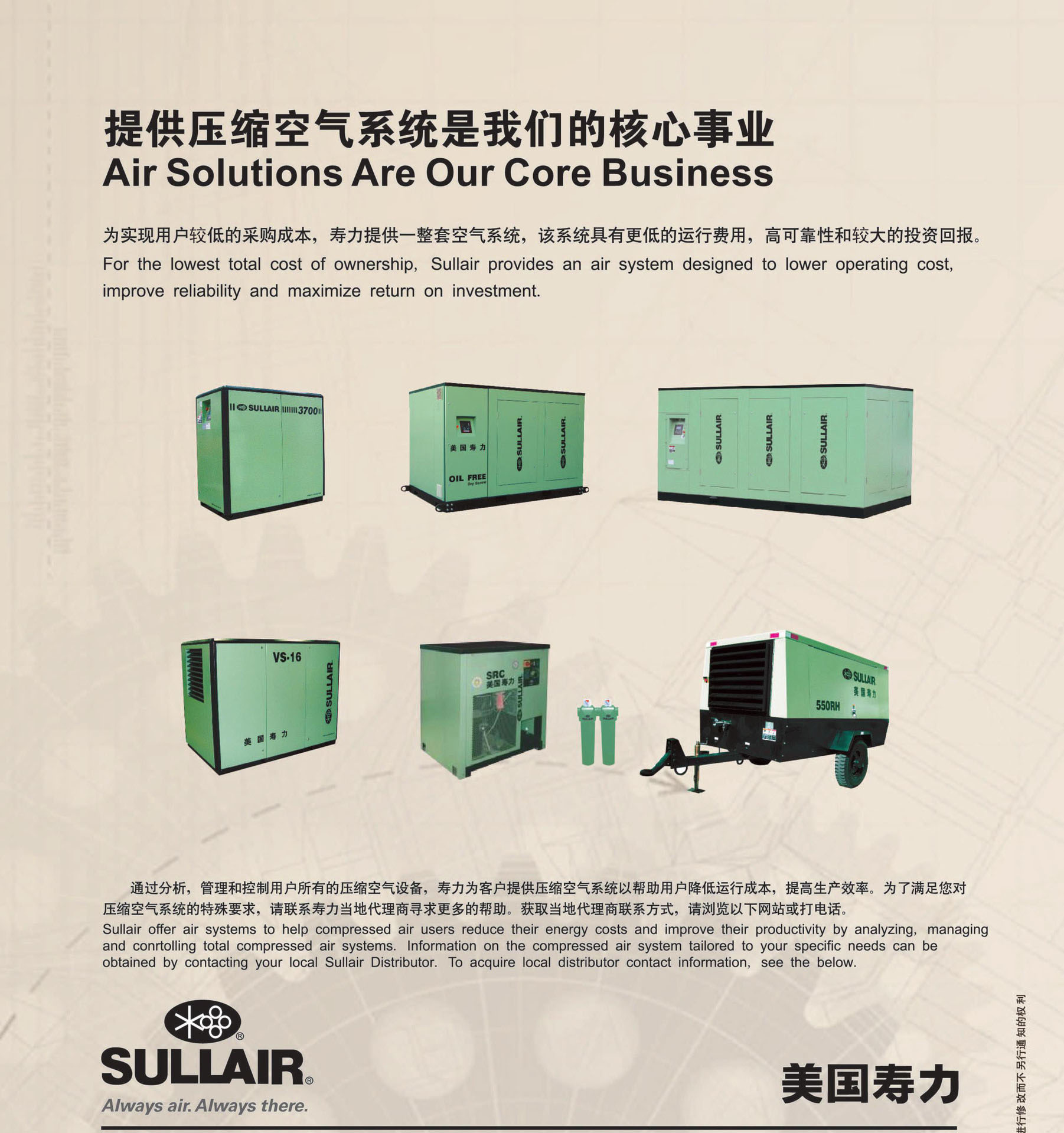 美国寿力亚洲公司(SULLAIR ASIA LTD. )作为寿力公司的亚洲总部,成立于1994年,由中国南山开发集团股份有限公司和美国寿力公司合资组建,致力于亚洲地区的产品经营,产品包括固定式螺杆空气压缩机、移动式螺杆空气压缩机、离心式压缩机、螺杆真空泵、空气干燥机、精密过滤器、气动工具等。公司发展迅速,现已分别在北京、上海、成都、沈阳、西安和武汉设立了分公司,另外在台湾、新加坡、马来西亚和泰国也设有分公司。产品市场占有率节节上升,“寿力”品牌已深入人心。
