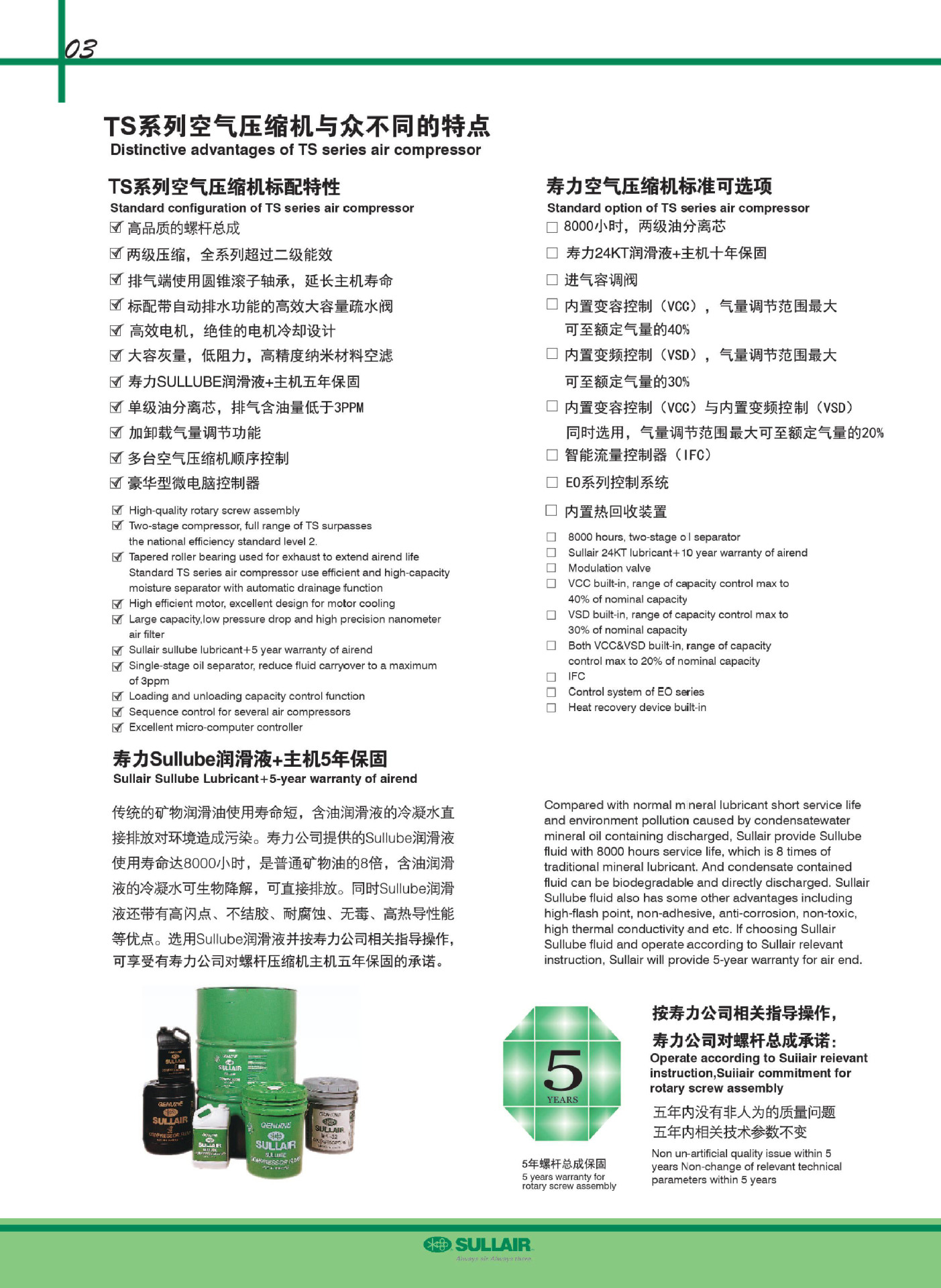 美国寿力公司(SULLAIR CORPORATION)隶属美国联合技术集团(UNITED TECHNOLOGIES CORPORATION),年营业额逾400亿美元,为全球500强企业之一,是螺杆式空压机的专业制造厂商。寿力创始于1965年,总部位于美国印地安那州密执根市,因其专业设计和制造的优势,始终处于螺杆技术的优势地位,公司生产的24KT十年保固螺杆压缩机为最典型代表产品,更是高品质产品代表。其他产品包括螺杆真空泵、移动式螺杆压缩机及空气干燥机、精密过滤器、气动工具等,被广泛运用于各行各业。美国寿力公司凭籍其丰富的经验和不断创新的技术,成为专业的压缩空气系统供应商。