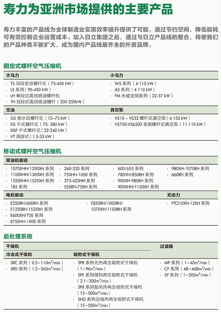 美国寿力亚洲公司(SULLAIR ASIA LTD. )作为寿力公司的亚洲总部,成立于1994年,由中国南山开发集团股份有限公司和美国寿力公司合资组建,致力于亚洲地区的产品经营,产品包括固定式螺杆空气压缩机、移动式螺杆空气压缩机、离心式压缩机、螺杆真空泵、空气干燥机、精密过滤器、气动工具等。公司发展迅速,现已分别在北京、上海、成都、沈阳、西安和武汉设立了分公司,另外在台湾、新加坡、马来西亚和泰国也设有分公司。产品市场占有率节节上升,“寿力”品牌已深入人心。