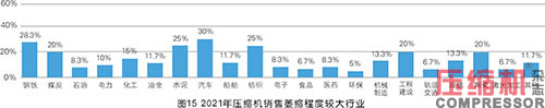 调研数据显示,2021年压缩机销售增长强劲行业前五位包括机械加工、环保装备配套(污水处理/垃圾焚烧发电)、医药、电子制造和激光加工。认为销售萎缩程度较大的前五个行业 包括:煤炭、水泥、钢铁、纺织和玻璃行业。事实上,这也是近两三年中国工业经济转型升级的现状,先进制造业、环保行业崛起,传统资源型行业不断受宏观政策调控影响,对空压机的需求并不十分旺盛。不过,在中国经济平稳发展的形势下,各个行业对空压机的需求并不会大起大落,因而销售强劲与萎缩只是相对而言。具体到企业,还是需要尽力下沉到各个行业,不可偏颇。