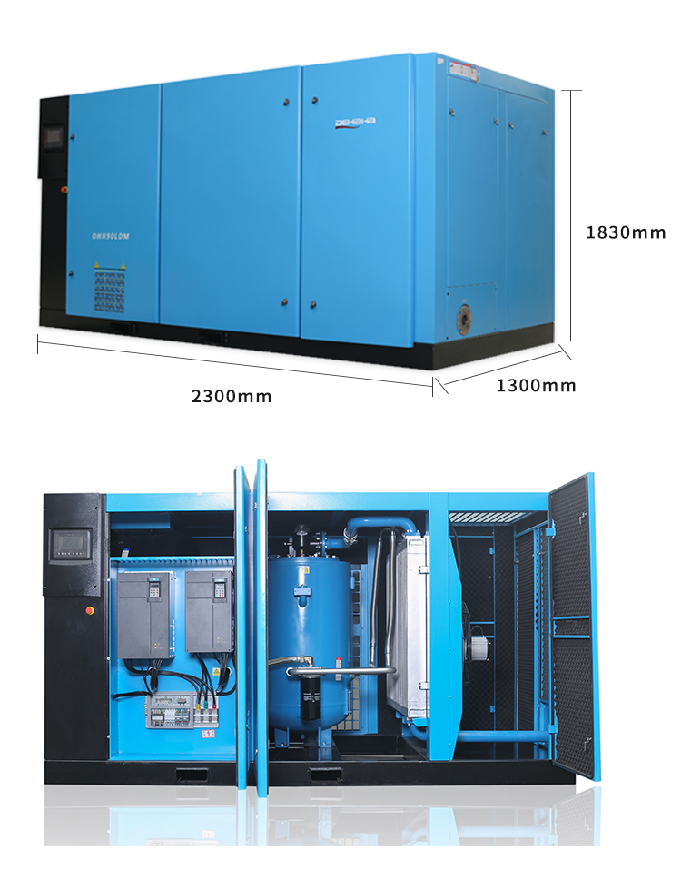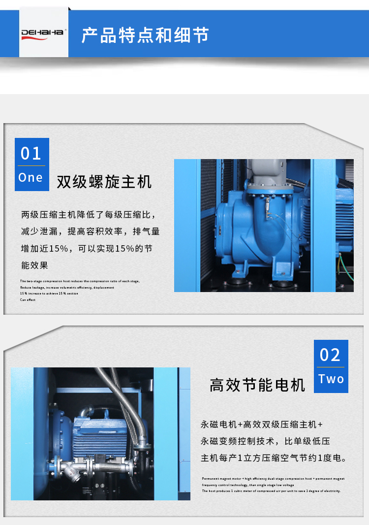 1、双主机设计,将一级压缩和二级压缩主机分开控制,并分别通过永磁电机传动,使每级压缩都能获得较高效率;