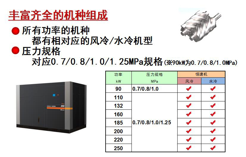 日立自1911年推出75KW的日立牌活塞机以来,在压缩机生产工业中已有近100年的生产历史,凭籍日立的先进技术,最高品质及优秀服务,日立一直扮演着领导者的角色,近年来面对能源的有效利用和节约的挑战,日立在1993年率先推出世界首创的变频调速日立螺杆压缩机,深受客户好评成为日立的招牌产品。今天累计10万台以上的日立螺杆压缩机服务于世界各地。不断满足客户的需求,日立空气压缩机将是您在生产技术革新上最值得信赖的伙伴。