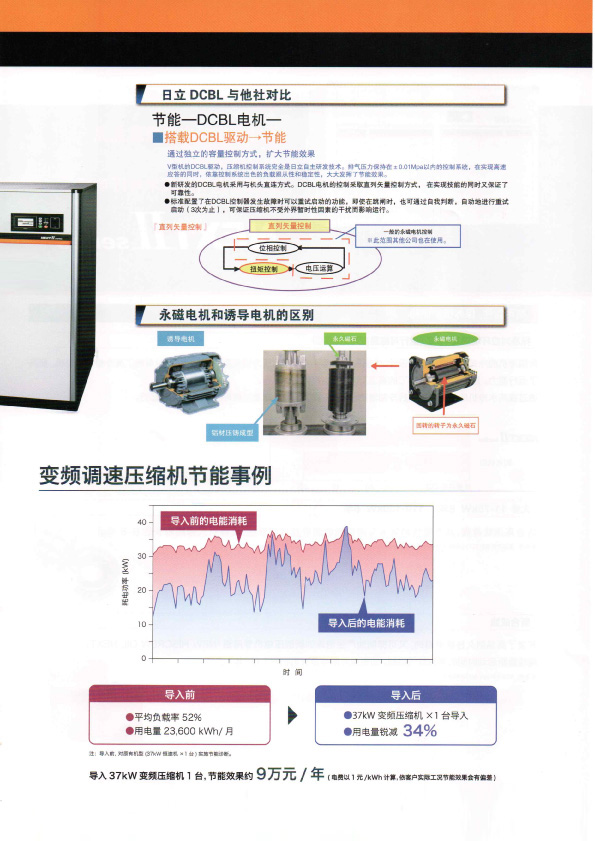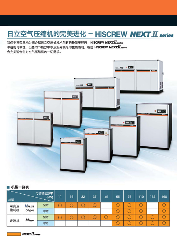 日立自1911年推出75KW的日立牌活塞机以来,在压缩机生产工业中已有近100年的生产历史,凭籍日立的先进技术,最高品质及优秀服务,日立一直扮演着领导者的角色,近年来面对能源的有效利用和节约的挑战,日立在1993年率先推出世界首创的变频调速日立螺杆压缩机,深受客户好评成为日立的招牌产品。今天累计10万台以上的日立螺杆压缩机服务于世界各地。不断满足客户的需求,日立空气压缩机将是您在生产技术革新上最值得信赖的伙伴。