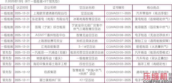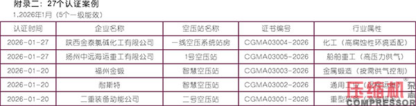 中国通用机械工业协会(CGMIA)发布的压缩空气站认证公示数据显示,2025年8月-2026年1月共公示27个认证案例,其中一级能效22个、领先型5个,覆盖12个省份/直辖市,工业密集区(长三角、珠三角)占比超60%。这为我们分析未来空压机站的发展趋势提供了重要依据。