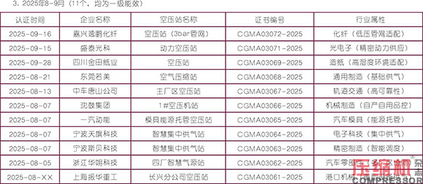 中国通用机械工业协会(CGMIA)发布的压缩空气站认证公示数据显示,2025年8月-2026年1月共公示27个认证案例,其中一级能效22个、领先型5个,覆盖12个省份/直辖市,工业密集区(长三角、珠三角)占比超60%。这为我们分析未来空压机站的发展趋势提供了重要依据。