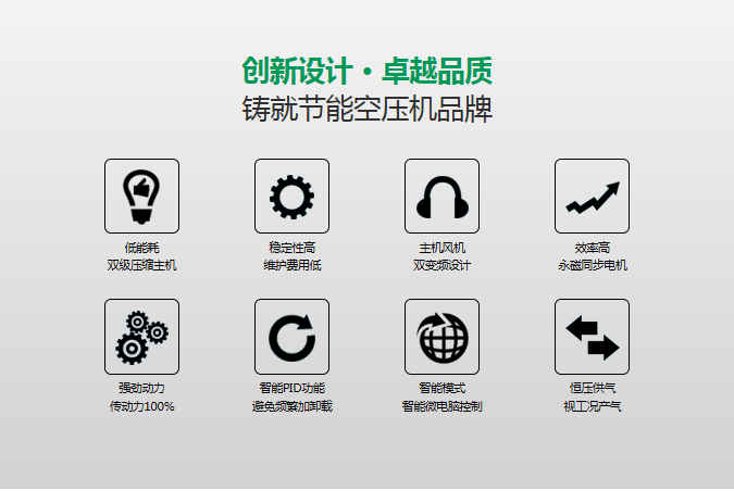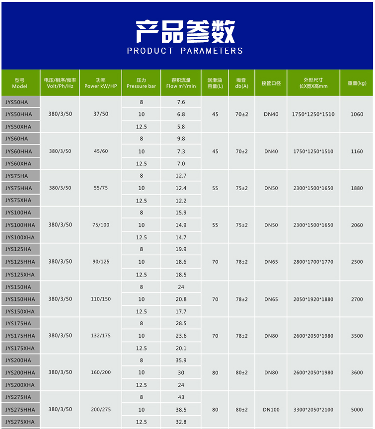 作为国内最早的螺杆式空气压缩机、活塞式空气压缩机、涡旋式空气压缩机和干燥机研发制造商,产品范围覆盖活塞式空压机从1/2HP到30HP;螺杆式空气压缩机从7.5HP到450HP;涡旋式空气压缩机从3HP到60HP;冷干机处理气量最大到100m³/min。活塞式空气压缩机、涡旋式空气压缩机和螺杆式空气压缩机生产能力达到50000台套/年。自2014年开始,积极响应国家关于节能环保减排的号召,大力推出各规格永磁变频、双级压缩节能空压机和无油涡旋空压机,为企业降低电费消耗,净化空气环境,增强制造型企业的竞争力。